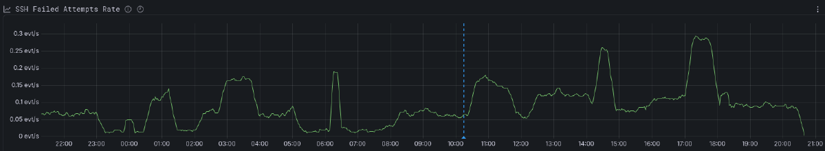 The baseline was about 0.05–0.06 events/sec — the “ambient noise” of the internet. But in the previous 11 hours, the rate had doubled, peaking at 0.28 events/sec. This pattern was later described as initial mapping Friday followed by actual attempts to brute force on Saturday.