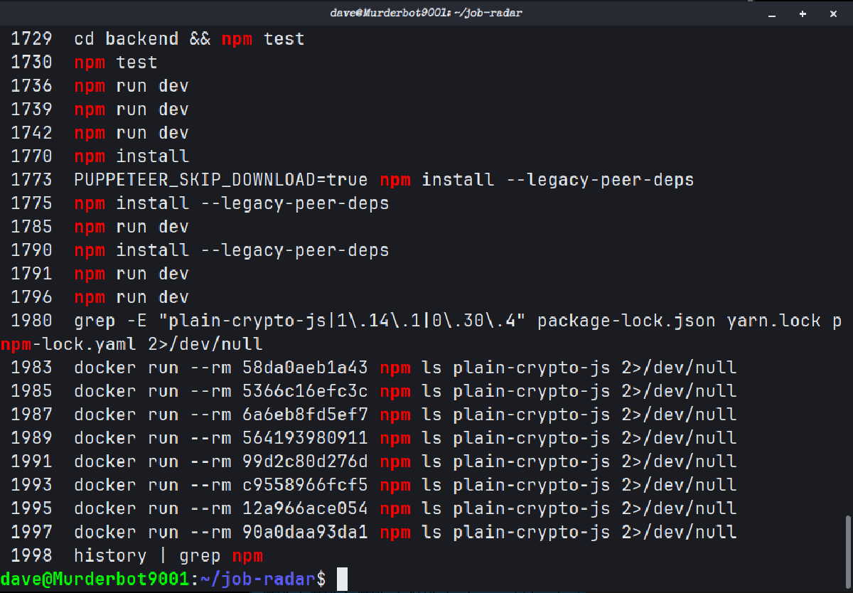 docker run --rm -it job-radar-image npm ls plain-crypto-jsSo nothing comes up, but… what about dependencies? Well, the lock files map out the entire dependency tree, and if a package did require it, then the package manager would have written it into the lock file with the version number.